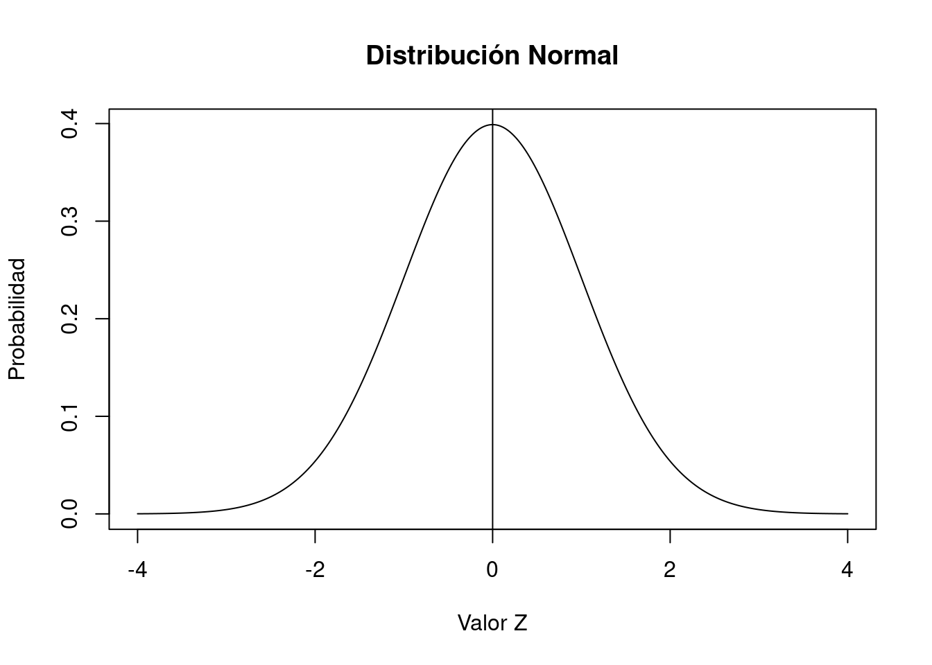 plot(x_values,y_values,type="l",xlab="Valor Z",ylab="Probabilidad",main="Distribución Normal")