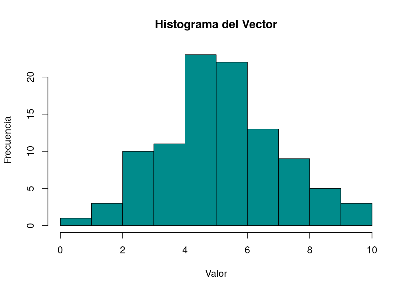 hist(vector,main="Histograma del Vector",xlab="Valor",ylab="Frecuencia",col="cyan4",border="black")