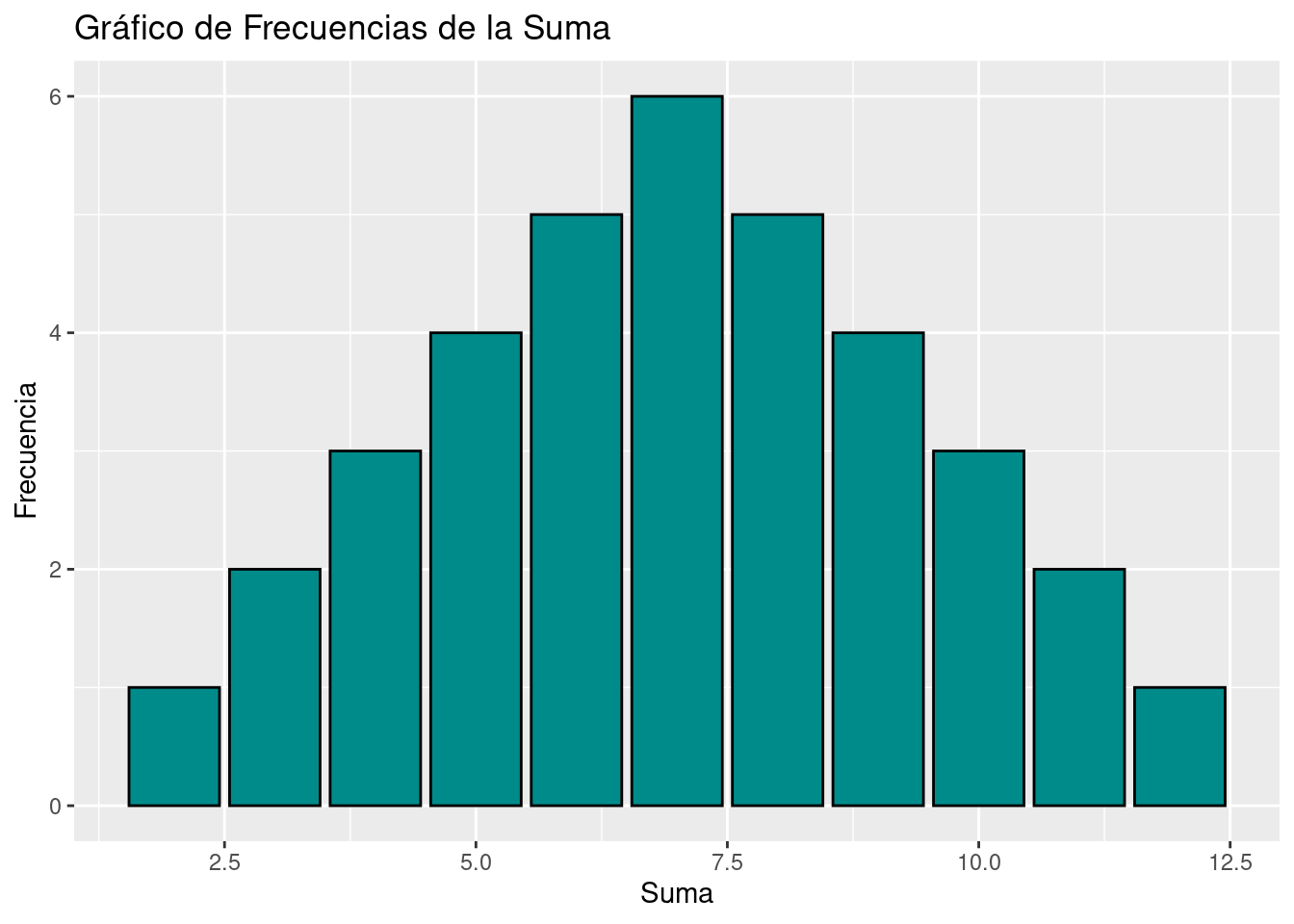 labs(title = "Gráfico de Frecuencias de la Suma", x = "Suma", y = "Frecuencia")