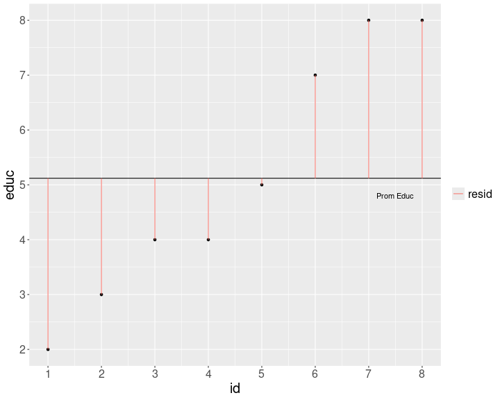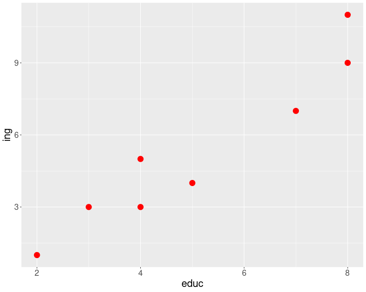 class: front .pull-left-wide[ # Estadística Correlacional] .pull-right-narrow[] ## Inferencia, asociación y reporte ---- .pull-left[ ## Juan Carlos Castillo ## Sociología FACSO - UChile ## 2do Sem 2024 ## [.orange[correlacional.netlify.app]](https:/correlacional.netlify.app) ] .pull-right-narrow[ .center[ .content-block-gray[ ## .gray[Sesión 8:] ## .curso[Asociación y covarianza]] ] ] --- layout: true class: animated, fadeIn --- class: middle .pull-left[ .content-box-red[ ## Hasta ahora (Unidad 1) - Probabilidad, teorema central del límite, error estándar, hipótesis, **diferencias entre grupos** ] ] -- .pull-right[ .content-box-green[ ## Ahora (Unidad 2) - Asociación: ¿en qué medida dos fenómenos (sociales) se encuentran **vinculados**? ] ] --- class: inverse middle center # ¿Por qué es importante estudiar **.yellow[asociación]** en ciencias sociales? --- # Ejemplo: ranking y privados en la educación superior <br> ## [https://observablehq.com/@elaval/perfil-de-carreras-segun-origen-escolar](https://observablehq.com/@elaval/perfil-de-carreras-segun-origen-escolar) --- class: roja ## Objetivos de la sesión de hoy <br> ### 1. Comprender los conceptos de covarianza y correlación ### 2. Aprender el cálculo de ambos coeficientes y su interpretación ### 3. Entender las limitaciones del coeficiente y su consideración en el cálculo e interpretación --- class: middle center # Lectura: Moore 97-131 Análisis de relaciones --- # Ejemplo minimalista: educación e ingreso - simulamos datos para - 8 casos - 8 niveles de .red[educación] (ej: desde basica incompleta=1 hasta postgrado=8) - 12 niveles de rangos de .red[ingreso] (ej: desde menos de 100.000=1 hasta más de 10.000.000=12) --- # Generación de datos para el ejemplo .pull-left[ ``` r educ <-c(2,3,4,4,5,7,8,8) ing <-c(1,3,3,5,4,7,9,11) data <-data.frame(educ,ing) ``` ] .pull-right[ .small[ ``` r kableExtra::kbl(data) ``` <table> <thead> <tr> <th style="text-align:right;"> educ </th> <th style="text-align:right;"> ing </th> </tr> </thead> <tbody> <tr> <td style="text-align:right;"> 2 </td> <td style="text-align:right;"> 1 </td> </tr> <tr> <td style="text-align:right;"> 3 </td> <td style="text-align:right;"> 3 </td> </tr> <tr> <td style="text-align:right;"> 4 </td> <td style="text-align:right;"> 3 </td> </tr> <tr> <td style="text-align:right;"> 4 </td> <td style="text-align:right;"> 5 </td> </tr> <tr> <td style="text-align:right;"> 5 </td> <td style="text-align:right;"> 4 </td> </tr> <tr> <td style="text-align:right;"> 7 </td> <td style="text-align:right;"> 7 </td> </tr> <tr> <td style="text-align:right;"> 8 </td> <td style="text-align:right;"> 9 </td> </tr> <tr> <td style="text-align:right;"> 8 </td> <td style="text-align:right;"> 11 </td> </tr> </tbody> </table> ] ] --- class: middle center  --- class: inverse middle center ## Midiendo dispersión: <br> #### `$$Varianza=\sigma^{2}={\sum_{i=1}^{N}(x_{i}-\bar{x})^{2}\over {N - 1}}$$` --- .pull-left-narrow[ <br> <br> <br> <br> <br> `$$\sigma^{2}={\sum_{i=1}^{N}(x_{i}-\bar{x})^{2}\over {N - 1}}$$` ] .pull-right-wide[  ] --- .pull-left-narrow[ <br> <br> <br> <br> <br> `$$\sigma^{2}={\sum_{i=1}^{N}(x_{i}-\bar{x})^{2}\over {N - 1}}$$` ] .pull-right-wide[  ] --- <!-- --> --- .pull-left[ # Varianza educación `$$Varianza=\sigma^{2}={\sum_{i=1}^{N}(x_{i}-\bar{x})^{2}\over {N - 1}}$$` .small[ ``` r mean(data$educ) ``` ``` [1] 5.125 ``` ``` r data$mean_educ <- mean(data$educ) data$dif_m_educ <- data$educ-data$mean_educ data$dif_m_educ2 <- (data$dif_m_educ)^2 ``` ]] -- .pull-right[ .small[ ``` r kbl(data, digits = 2) %>% scroll_box(width = "500px", height = "450px") ``` <div style="border: 1px solid #ddd; padding: 0px; overflow-y: scroll; height:450px; overflow-x: scroll; width:500px; "><table> <thead> <tr> <th style="text-align:right;position: sticky; top:0; background-color: #FFFFFF;"> id </th> <th style="text-align:right;position: sticky; top:0; background-color: #FFFFFF;"> educ </th> <th style="text-align:right;position: sticky; top:0; background-color: #FFFFFF;"> ing </th> <th style="text-align:right;position: sticky; top:0; background-color: #FFFFFF;"> mean_educ </th> <th style="text-align:right;position: sticky; top:0; background-color: #FFFFFF;"> dif_m_educ </th> <th style="text-align:right;position: sticky; top:0; background-color: #FFFFFF;"> dif_m_educ2 </th> </tr> </thead> <tbody> <tr> <td style="text-align:right;"> 1 </td> <td style="text-align:right;"> 2 </td> <td style="text-align:right;"> 1 </td> <td style="text-align:right;"> 5.12 </td> <td style="text-align:right;"> -3.12 </td> <td style="text-align:right;"> 9.77 </td> </tr> <tr> <td style="text-align:right;"> 2 </td> <td style="text-align:right;"> 3 </td> <td style="text-align:right;"> 3 </td> <td style="text-align:right;"> 5.12 </td> <td style="text-align:right;"> -2.12 </td> <td style="text-align:right;"> 4.52 </td> </tr> <tr> <td style="text-align:right;"> 3 </td> <td style="text-align:right;"> 4 </td> <td style="text-align:right;"> 3 </td> <td style="text-align:right;"> 5.12 </td> <td style="text-align:right;"> -1.12 </td> <td style="text-align:right;"> 1.27 </td> </tr> <tr> <td style="text-align:right;"> 4 </td> <td style="text-align:right;"> 4 </td> <td style="text-align:right;"> 5 </td> <td style="text-align:right;"> 5.12 </td> <td style="text-align:right;"> -1.12 </td> <td style="text-align:right;"> 1.27 </td> </tr> <tr> <td style="text-align:right;"> 5 </td> <td style="text-align:right;"> 5 </td> <td style="text-align:right;"> 4 </td> <td style="text-align:right;"> 5.12 </td> <td style="text-align:right;"> -0.12 </td> <td style="text-align:right;"> 0.02 </td> </tr> <tr> <td style="text-align:right;"> 6 </td> <td style="text-align:right;"> 7 </td> <td style="text-align:right;"> 7 </td> <td style="text-align:right;"> 5.12 </td> <td style="text-align:right;"> 1.88 </td> <td style="text-align:right;"> 3.52 </td> </tr> <tr> <td style="text-align:right;"> 7 </td> <td style="text-align:right;"> 8 </td> <td style="t
